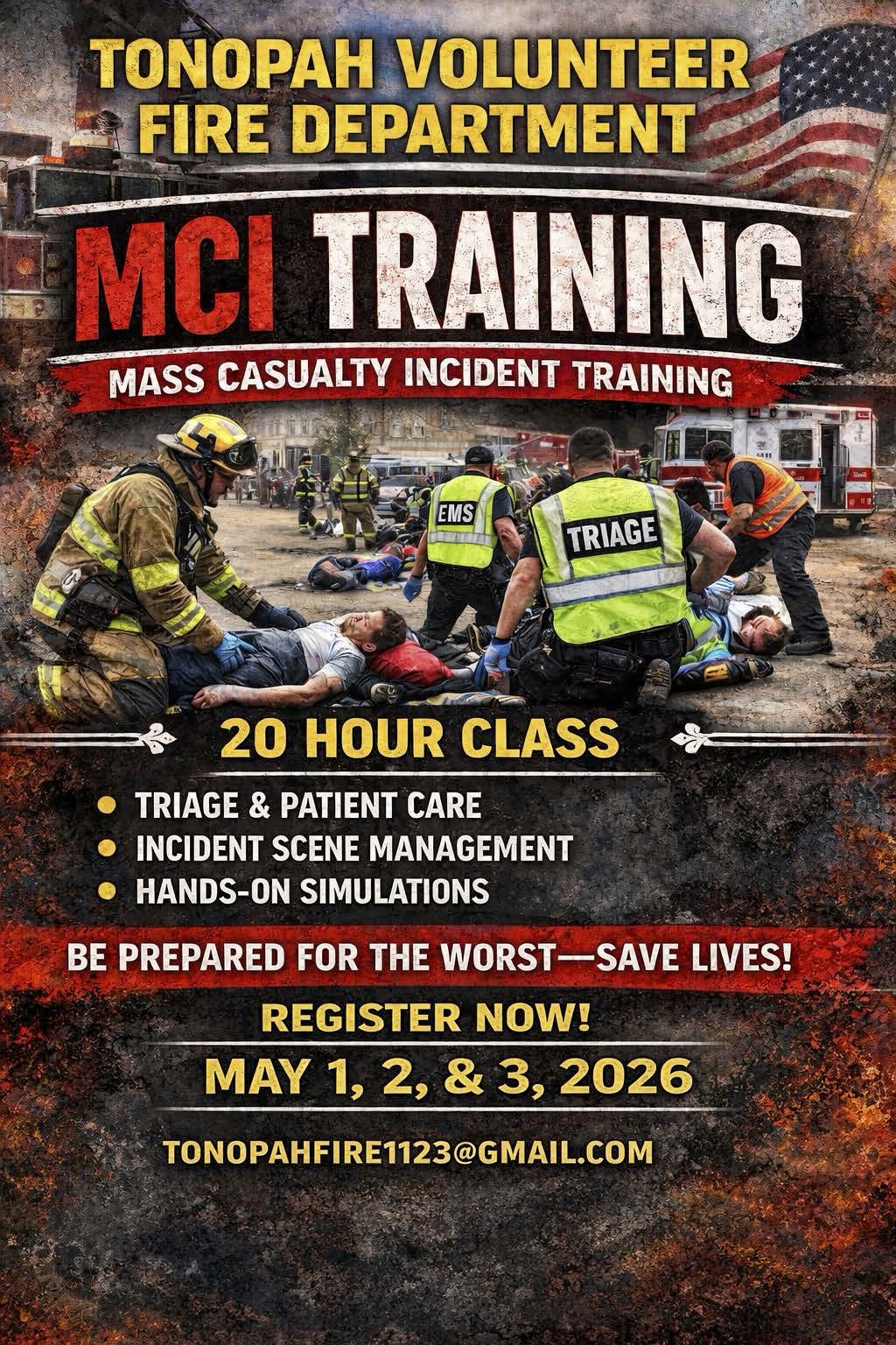 The Tonopah Volunteer Fire Department will be hosting a 20-hour Mass Casualty Incident (MCI) Training on May 1, 2, and 3, 2026. Participants will take part in realistic simulations that build the skills, confidence, and coordination needed to respond quickly and safely during critical incidents.