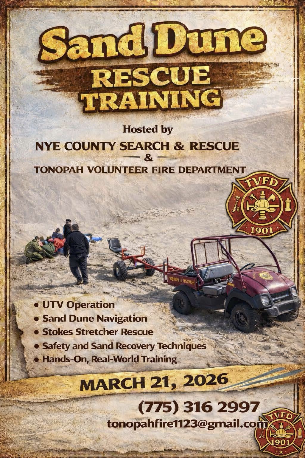 Nye County Search & Rescue and the Tonopah Volunteer Fire Department are teaming up to bring Sand Dune Rescue Training to the community on March 21, 2026. This hands-on training focuses on real-life rescue situations that can happen in our desert and dune areas.
