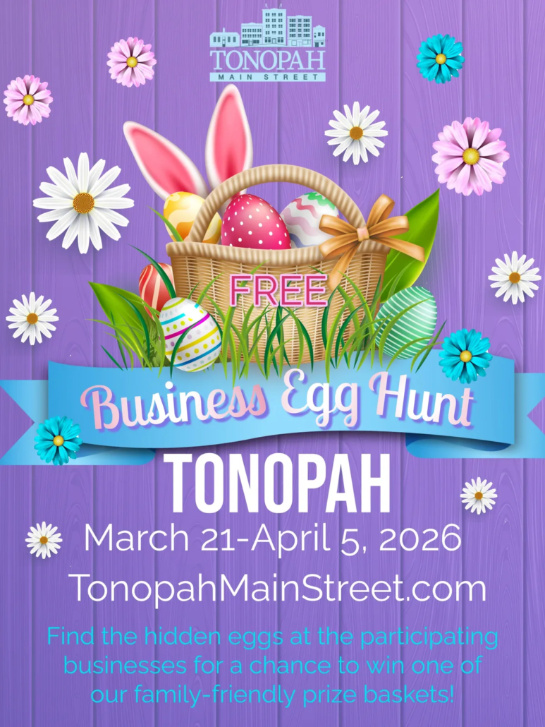 Hop into spring with a town-wide egg hunt! Visit participating Tonopah businesses, find the hidden eggs, and you could win one of several family-friendly prize baskets.