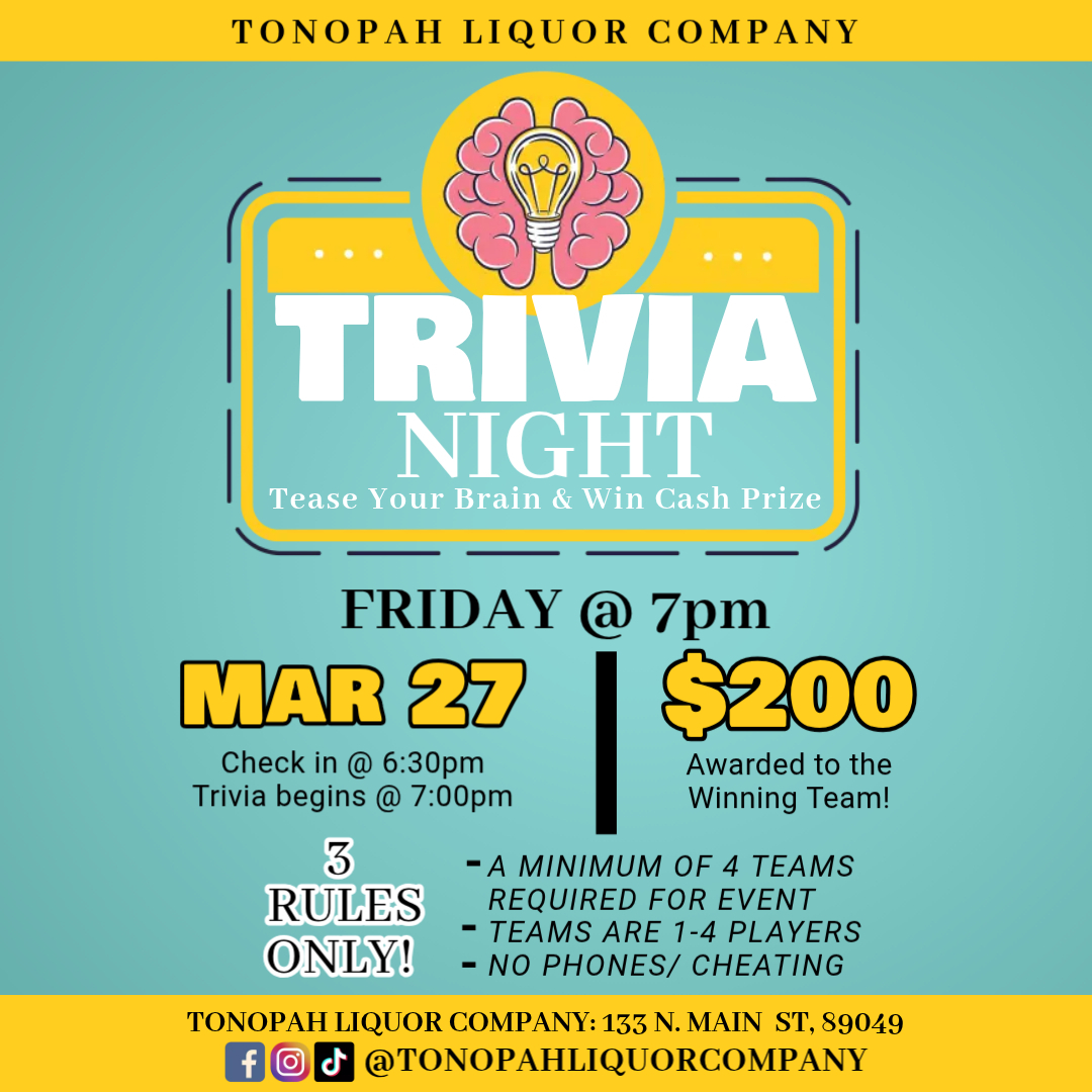 Trivia Night at Tonopah Liquor Co. Tease Your Brain and Win a Cash Prize! Check in 6:30 PM | Trivia Starts at 7 PM |