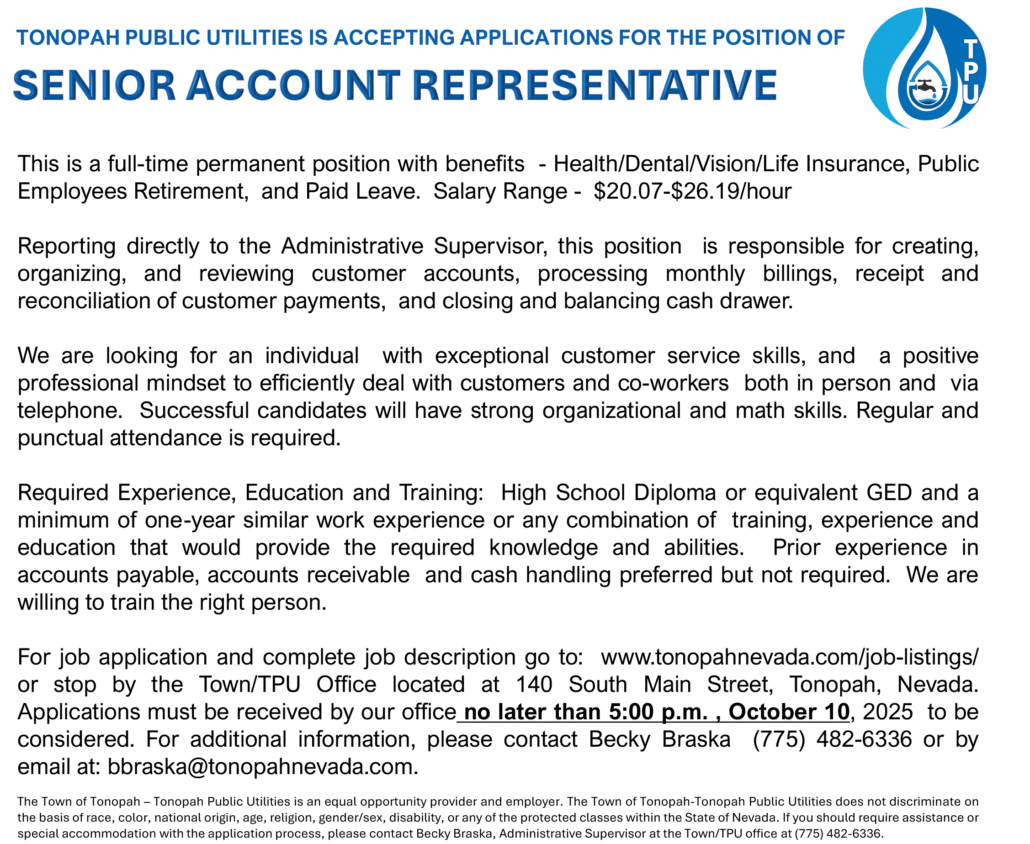 Complete job description and applications are available on our website at www.TonopahNevada.com/, or may be picked up at the Town office located at 140 S. Main Street, Tonopah, NV. This position will remain open until filled.